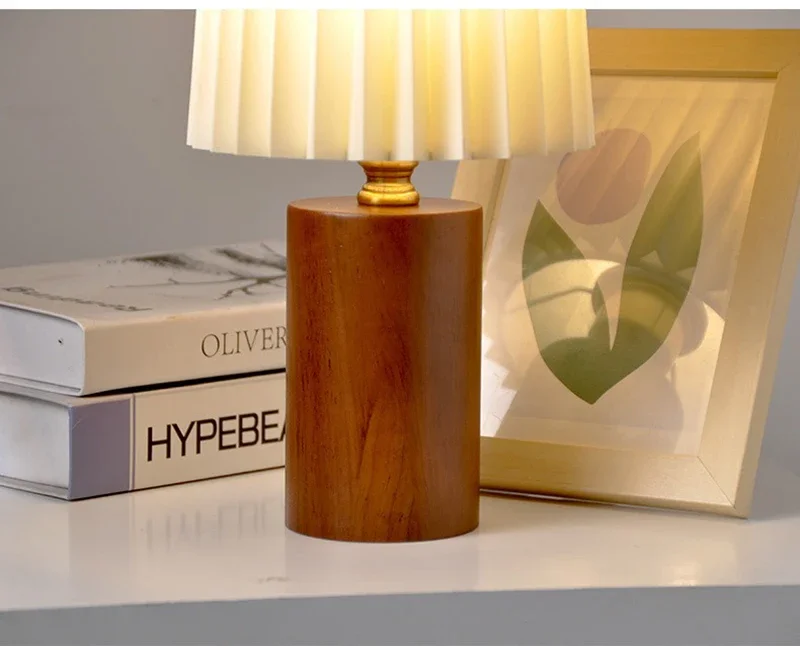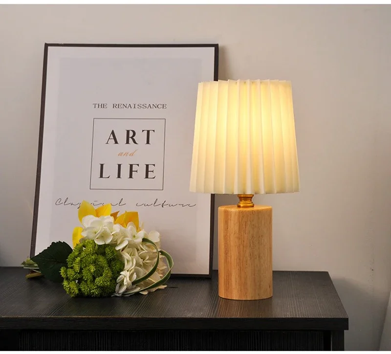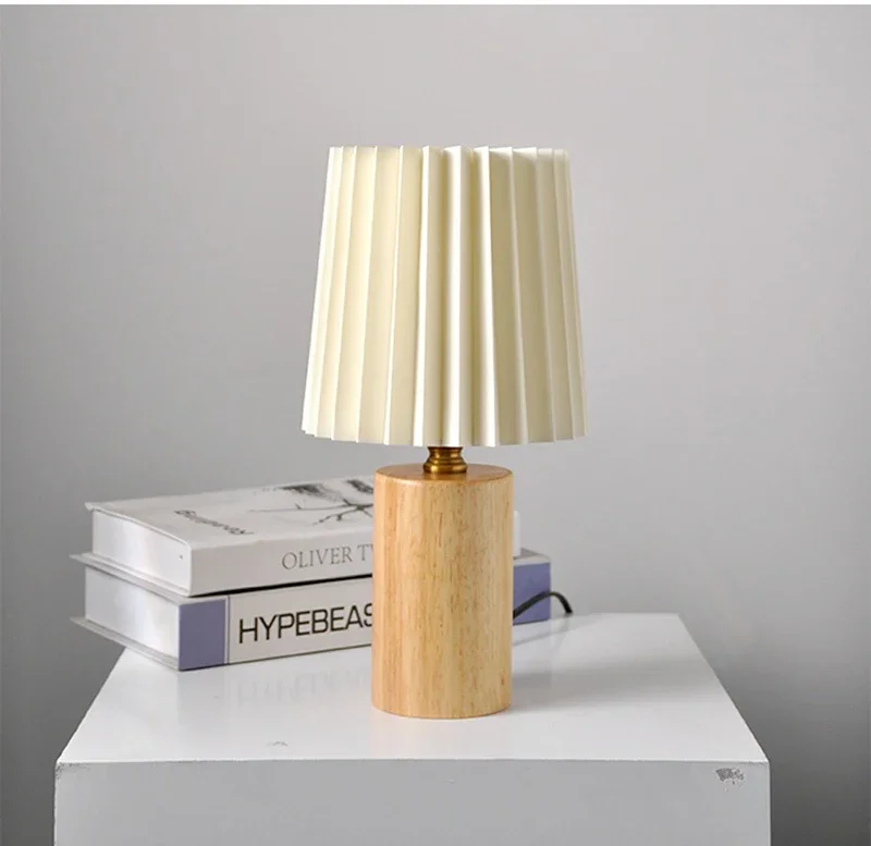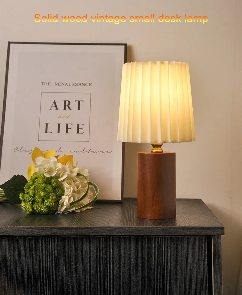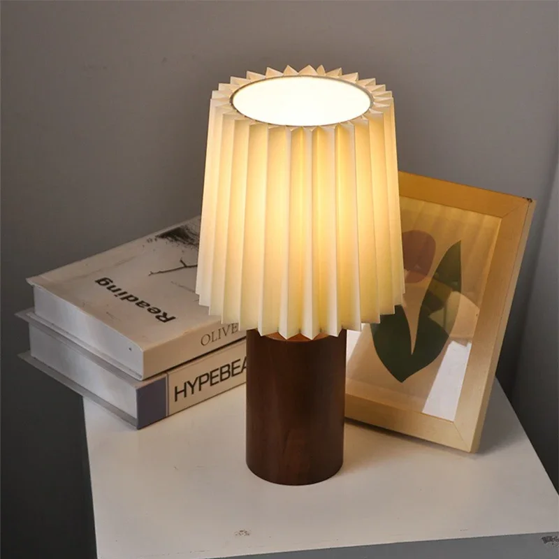 Abajur de Mesa Retrô Madeira com Cúpula Plissada