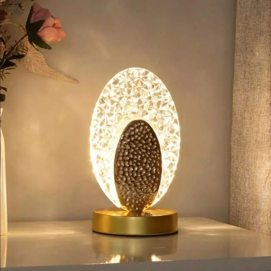 Com design criativo em formato oval, essa luminária combina cristais acrílicos brilhantes e base dourada sofisticada, tornando-se o destaque perfeito para quartos, salas de estar, escritórios ou mesas de cabeceira.