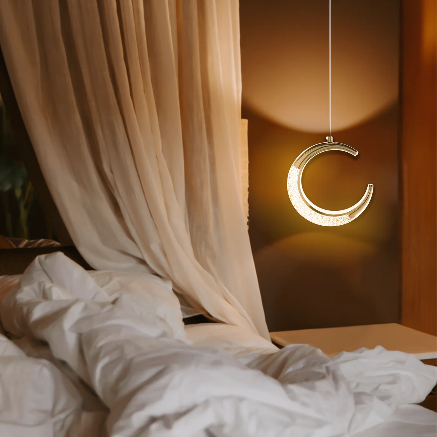 Com formato inspirado na lua, o pendente transmite delicadeza e ao mesmo tempo imponência. Seu acabamento dourado refinado adiciona um toque de luxo e exclusividade, criando uma atmosfera elegante e sofisticada. Seja no centro da sala de jantar, acima da mesa de reuniões ou como peça de destaque em um hall de entrada, o Pendente Lua se adapta facilmente a diferentes estilos de decoração — do minimalista ao contemporâneo.
