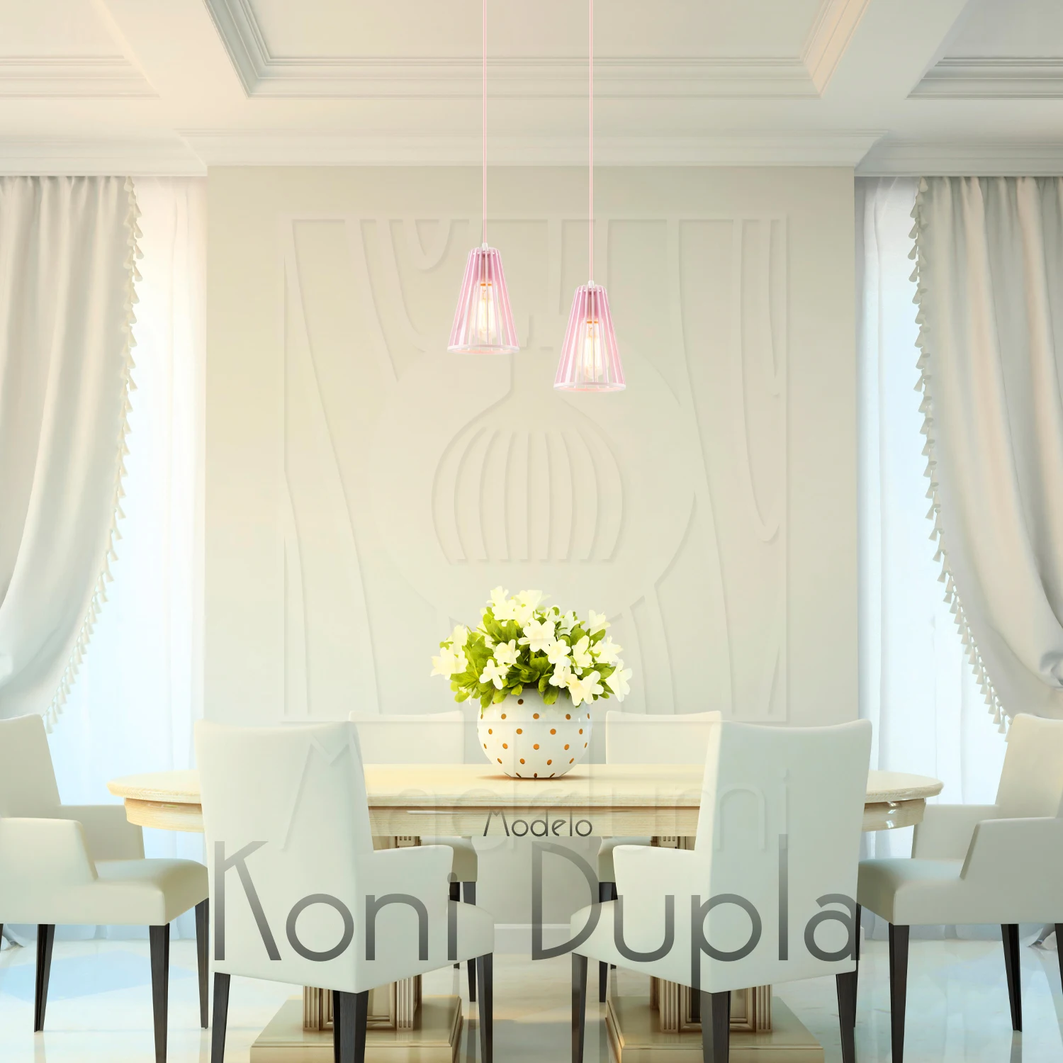 Compatível com lâmpadas E27, o Pendente Duplo Rosa Claro oferece flexibilidade total na escolha da iluminação: